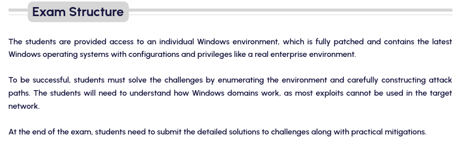 As the exam is self-service and can be started on demand, once begun, you are given 25 hours to gain Remote Code Execution on a specific number of fully patched servers, excluding the provided jump-box. The exam is designed to emulate an insider threat simulation/assumed compromise scenario.