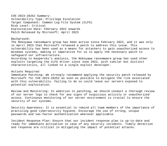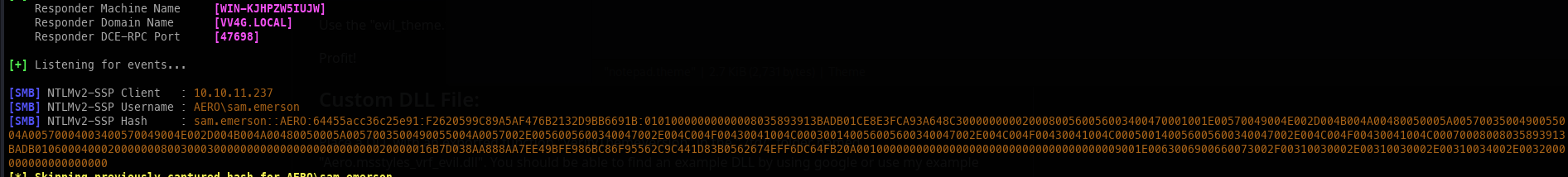 Aero is a medium-difficulty Windows machine featuring two recent CVEs: CVE-2023-38146 , affecting Windows 11 themes, and CVE-2023-28252 , targeting the Common Log File System (CLFS). Initial access is achieved through the crafting of a malicious payload using the ThemeBleed proof-of-concept, resulting in a reverse shell. Upon gaining a foothold, a CVE disclosure notice is found in the user's home directory, indicating vulnerability to CVE-2023-28252 . Modification of an existing proof-of-concept is required to facilitate privilege escalation to administrator level or code execution as NT Authority\SYSTEM.