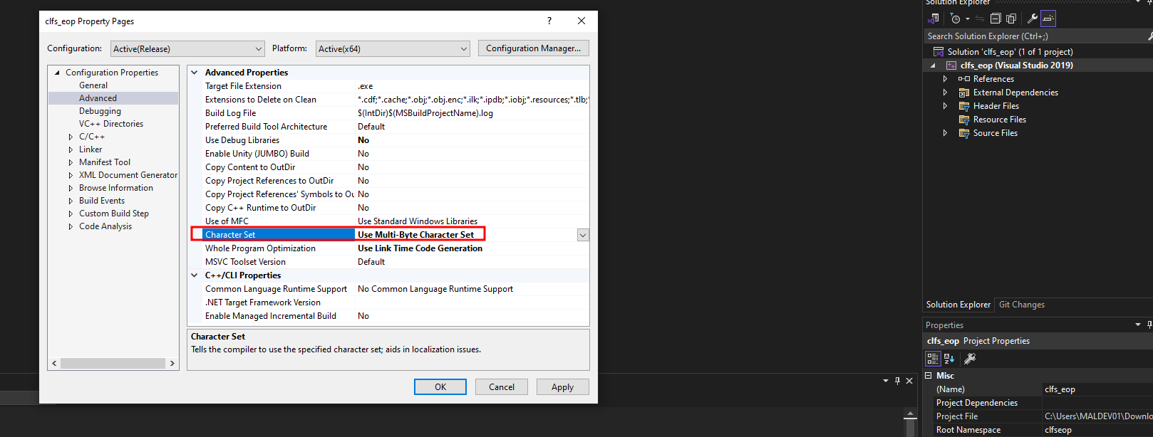 clfs_eopin the Solution Explorer and select Properties). - Under Configuration Properties > Advanced, set "Character Set" to "Use Multi-Byte Character Set." Then, click "Rebuild Solution".