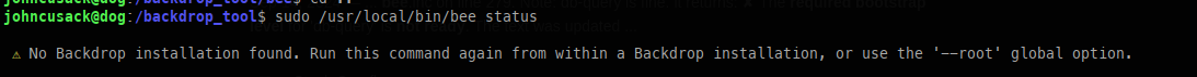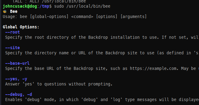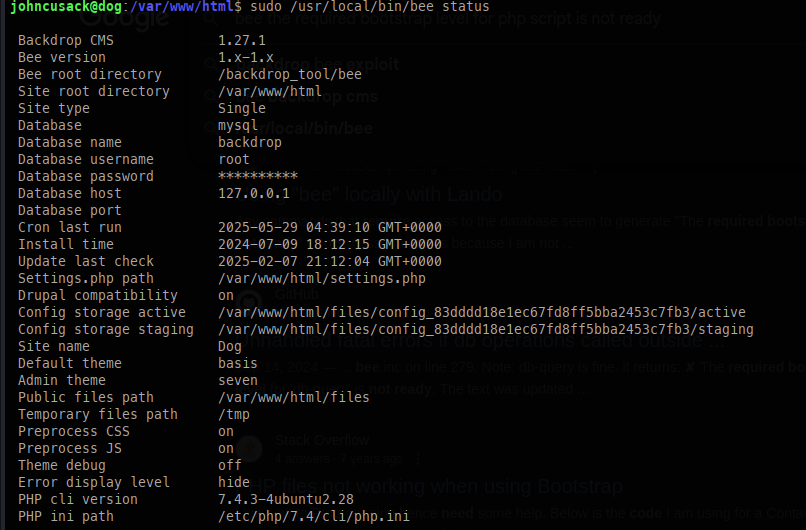 When attempting to execute commands, they failed because they weren’t run from the website’s root directory. This is because the web application in question is managed by bee.