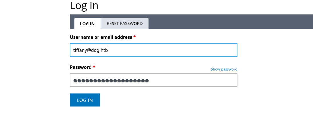 Using the two usernames from the .git files and the password, we can attempt to log in. We find that tiffany@dog.htb with the password BackDropJ2024DS2024 grants us access.