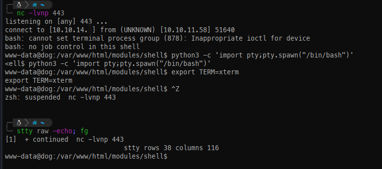 - Catch the shell and spawn a TTY to ensure a stable session moving forward.