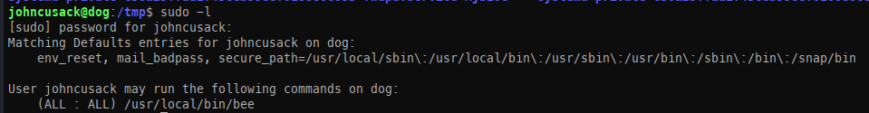 Once we had access, we enumerated this user’s privileges and found that we have sudo permission to run bee.