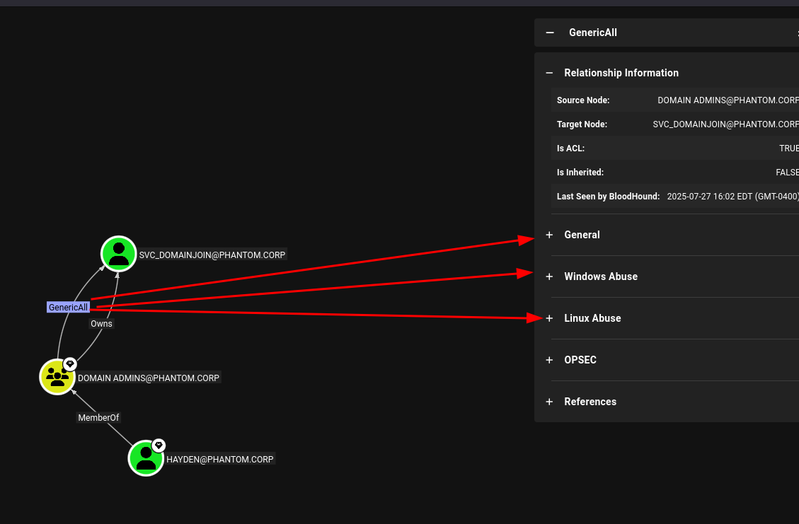 For demonstration purposes, let’s assume the Owns Object control is not present, and you're unsure how to use GenericAll. Fortunately, BloodHound includes built-in references to help guide you through abusing this type of control.