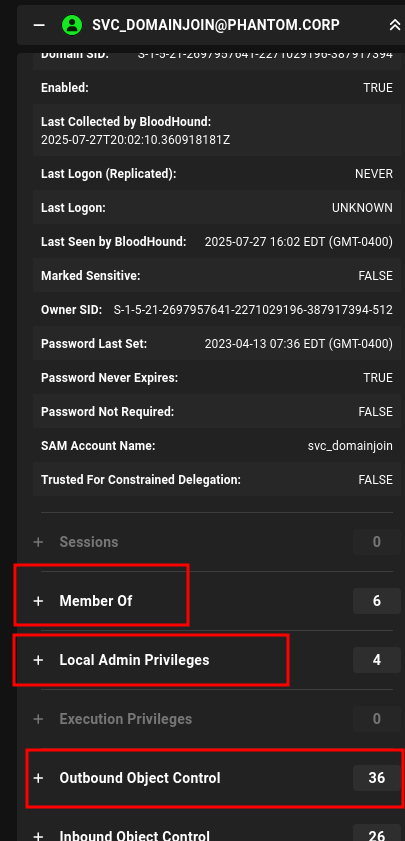 Once we have an object to enumerate, we can select it to examine interesting permissions such as "Outbound Object Control," "Local Admin Privileges," and "Member Of."