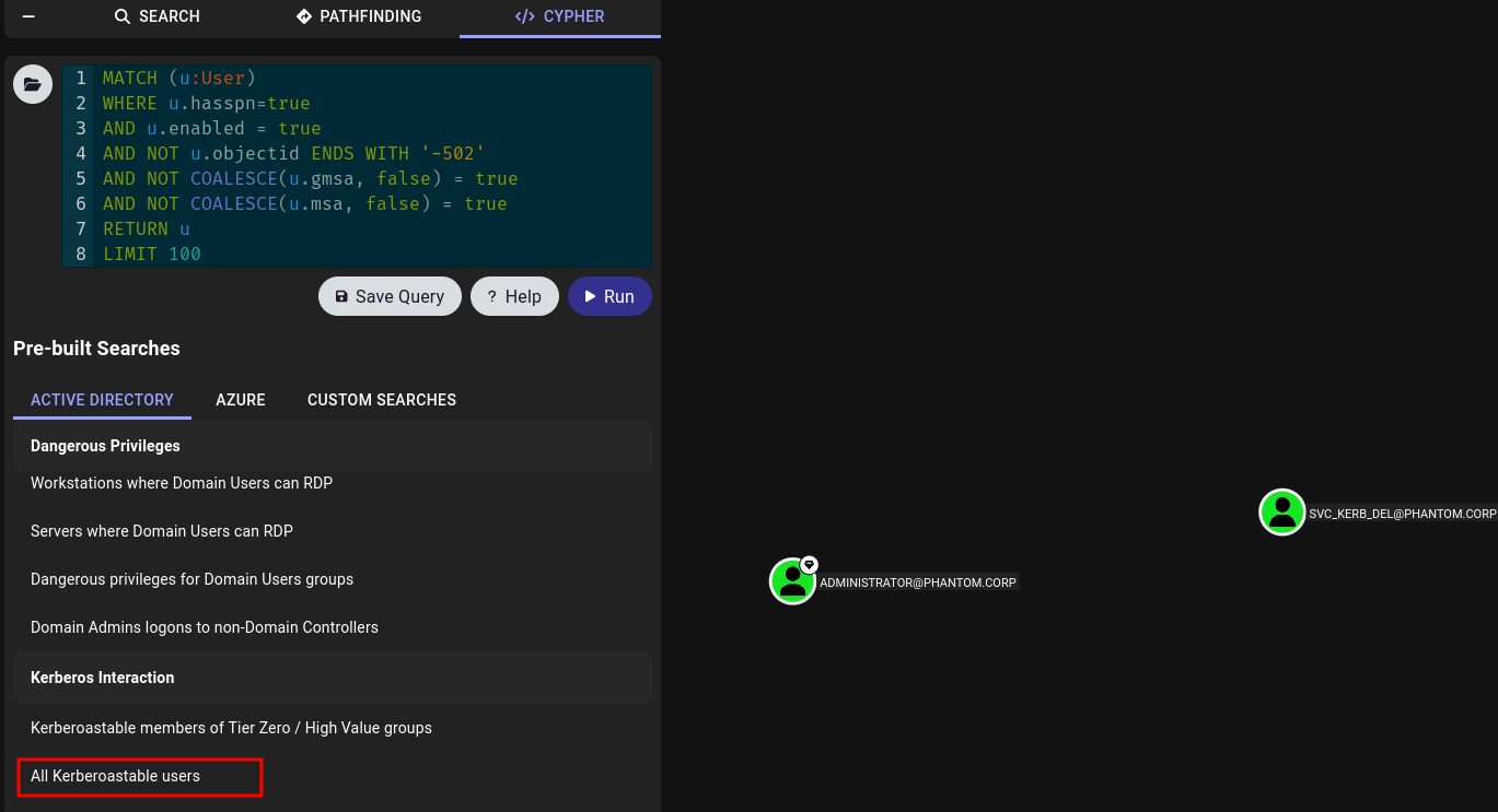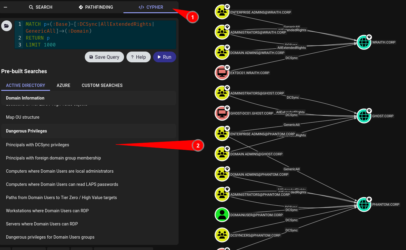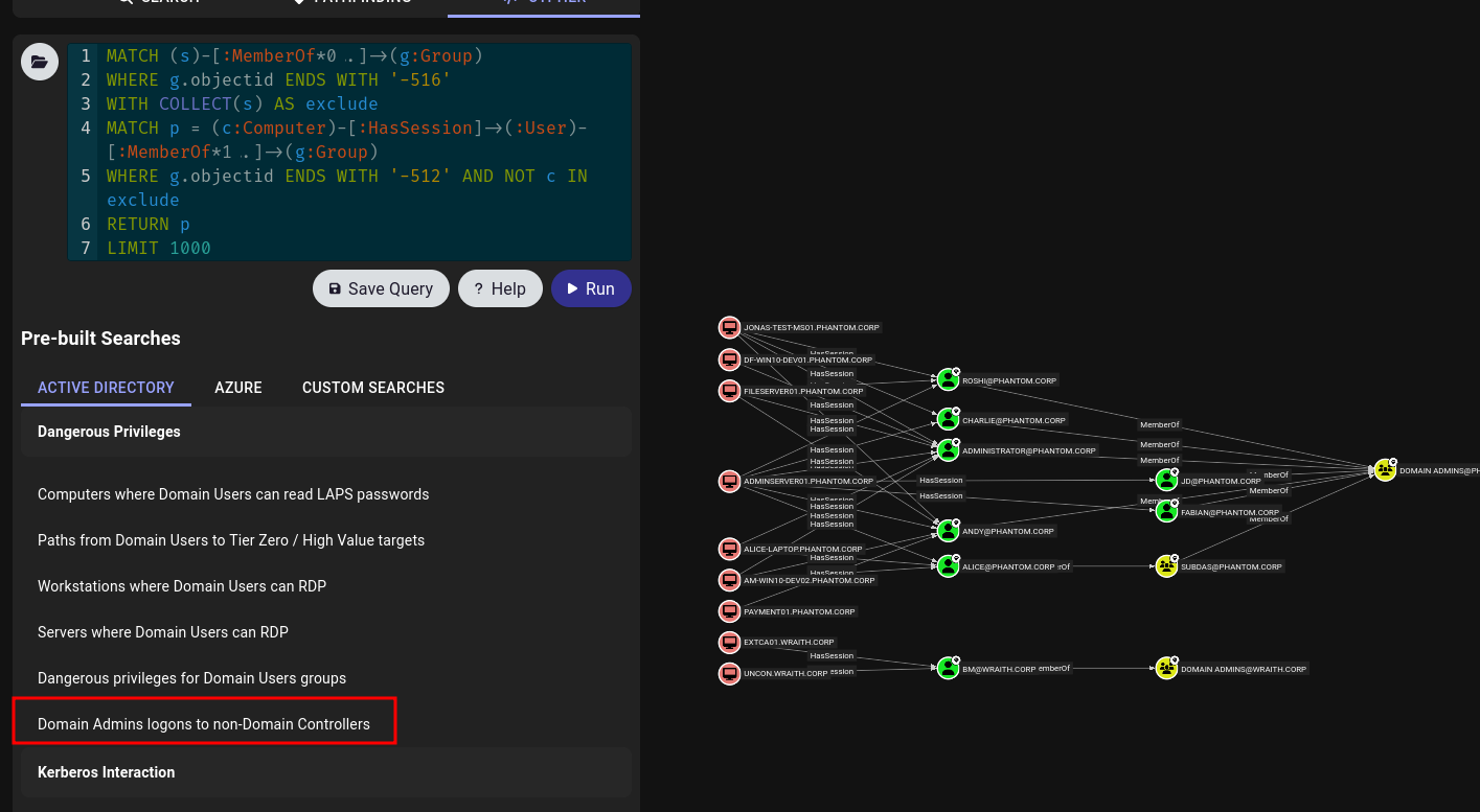 We can also use the pre-made Cypher queries to look for common attack paths, such as users with DCSync permissions, Kerberoastable users, or machines where a Domain Admin has logged in that are not Domain Controllers.