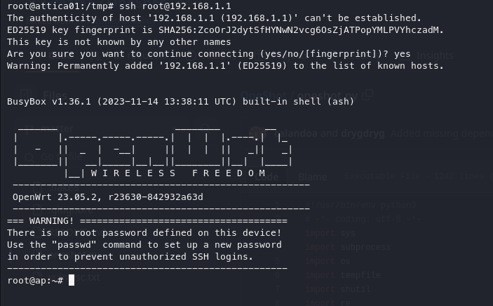 Now that we are on the wireless network, obtaining root access was straightforward; we just needed to SSH into the root account on the virtual router.