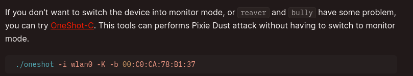 With a clear path in mind, we can now research how to exploit WPS. HackTricks can provide specific guidance, particularly on the Pixie Dust attack with a one-shot method.